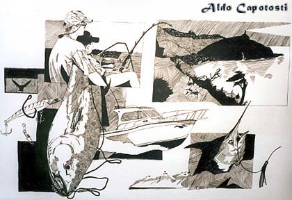 Ora, in attesa di tempi migliori, per il momento pesco così, con i dipinti a china da me realizzati e riguardanti appunto la pesca d'altura,