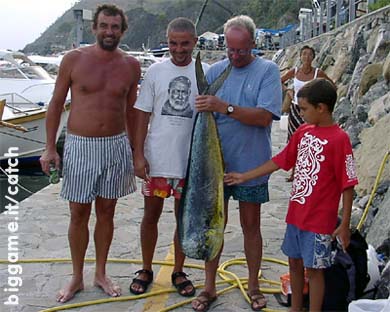 Vi invio anche la foto della preda pescata qualche giorno dopo nello stesso posto con la stessa tecnica, una lampuga di 12 Kg; probabilmente allamata in fase di stesa del palamito