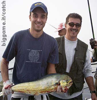 Ora Michele vuole fare un foto con la lampuga (risulterà poi del peso di 3 kg. per 75 cm. di lunghezza e a proposito io, Roberto, sono quello di fianco) ed il giovinastro rischia di fare altri danni maneggiando il pesce e tentando ripetutamente di farlo cadere fuori bordo, ma alla fine va tutto bene, anche se sembra che abbiamo scannato un maialino per il casino che abbiamo fatto.