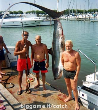 Alle 12,05 il mulinello comincia a urlare all'impazzata fino a quando non prendo in mano la canna e ferro; dopo circa un'ora e trenta di combattimento arriva al raffio uno splendido squalo volpe da 175 kg., mezz'ora per issarlo a bordo dopo non poche peripezie fatte dal volpe.