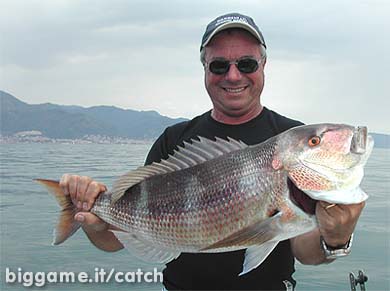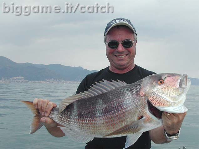 dentice pescato in drifting con la seppia su fondale di m.42 al largo di Genova. (se mi telegrafate Vi dò il punto preciso) del peso di Kg. 5.5