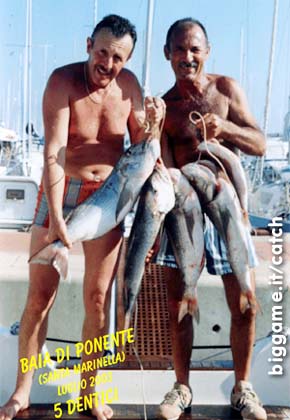 Dopo qualche miglio, all'improvviso una delle due canne parte. Non credevamo ai nostri occhi, il mulinello sfrizionava. Era lui !! Prendo subito la canna in mano e comincio il recupero. Era molto nervoso nel mentre Paolo mi calzava la cintura e teneva la barca dritta. Si trattava di un dentice di circa 7 Kg..