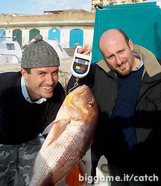 Dolcemente porta la barca verso la scaduta di una bella secca e appena inizia la risalita a quota meno 50, mi dice di calare l'esca a fondo e di tenermi pronto. Dopo solo pochi secondi (forse si era preventivamente accordato con il pesce!) avverto netta l'abboccata, cedo filo, aspetto che abbia ingoiato il boccone e poi ferro. Il dentice (2,9kg) stavolta non fa troppe storie e giunge rapido a paiolo.