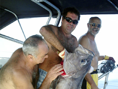 Le abboccate degli occhioni non tardano ad arrivare ma cio' che non ci aspettavamo e' stata una bella cernia di fondale da oltre 35 kg veri ::::::.