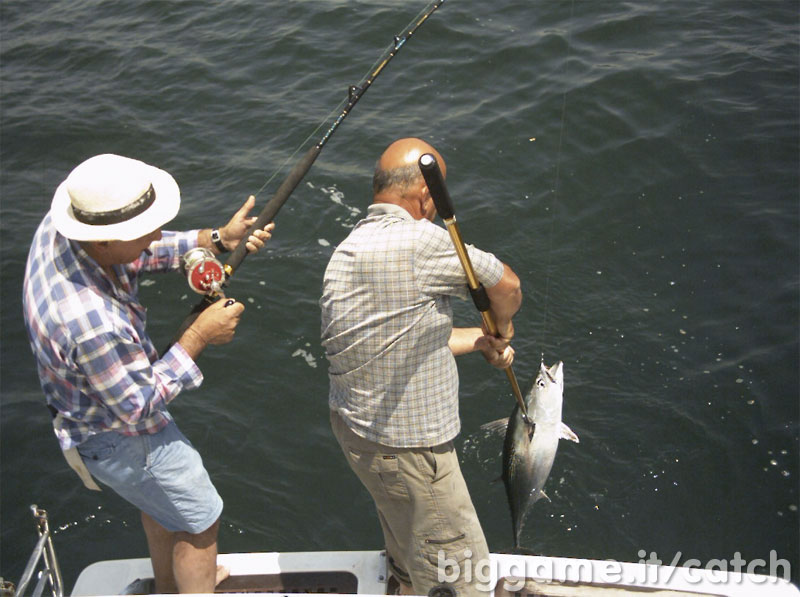 Dopo una decina di minuti di tira e molla, fughe, aggallamenti e picchiate, il primo pesce di 7, 8 kg circa è in barca. Poi tocca a me: sulla trenta libbre la storia si ripete con il medesimo esito. Dopo non molto è il turno di "Mariolino" e poi di Lorenzo.