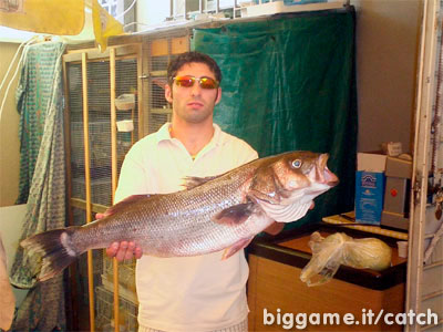 mi chiamo Tiziano, vi invio la foto di una grossa spigola pescata a Fiumicino (RM) con il gamberetto vivo.