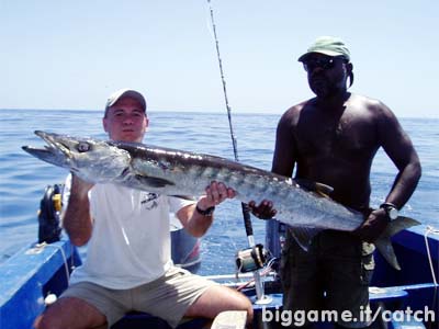 Tutto Ok, mi vedo sfortunato, ma si sa com'è, nella pesca bisogna sempre "piangere" e all'ennesima imprecazione la canna a mezz'acqua si inarca di colpo e il cicalino del Tiagra si mette a cantare…colpo di motore e brusca accelerata per una maggiore penetrazione dell'amo, questa volta non si deve slamare! Credo proprio che sia quello che cercavo, testate regolari e possenti, un quarto d'ora di intensa emozione e la sagoma è proprio la sua: il Barracuda, una via di mezzo tra un coccodrillo e un luccio, che solo negli ultimi istanti mi fa intravedere le sue dimensioni e fa sobbalzare pure Mohamed che di pesci, credetemi, ne ha visti parecchi più di tutti noi!