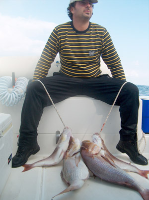 A questo punto eravamo pronti per affrontare la parte vera e propria di godimento curativo, quello che ti tiene a galla per una settimana o a scelta fino alla prossima pescata. Primo calamaro, primo dentex, molla spezzata, un morso, due morsi e zac, Davide si scatena nel suo repertorio di violente pompate che portano dopo 40 secondi un bel dentex di 5 kg. nel coppo abilmente manovrato da Daniele. Le transaminasi e gli altri valori fisici di Davide si abbassano per un notevole e subitaneo miglioramento fisico e anche mentale; la stanchezza è passata, anche le gambe gli sembrano uguali, la terapia inizia a funzionare.