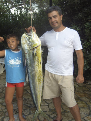Dopo una ventina di minuti di combattimento, caratterizzato da fughe potenti e velocissime e da salti fuori dall'acqua entusiasmanti, il grosso pesce che ormai ho riconosciuto comincia a dare segni di stanchezza e così dopo poco tempo il mio fido compagno di pesca Pietro che mi accompagna in tutte le mie battute di pesca (mio suocero) mi passa il raffio e con un colpo deciso e molta fatica il pesce è in barca.