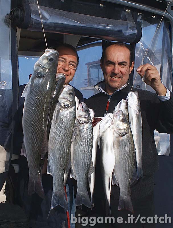 Dopo una notte insonne di rimorsi ed angoscie, appuntamento la mattina alle 8.00 al pontile, a far equipaggio sul MrGrady, ma non lo vediamo… Alziamo lo sguardo e scorgiamo la sagoma della barca fuori del porto, che rientrerà per caricarci con già 3 spigole a pagliolo… quale miglior auspicio per una giornata che si rivelerà storica.