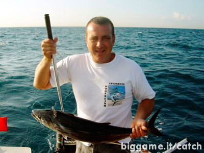 Neanche il tempo di pensarci due volte e la canna “parte” alla grande: la settimana scorsa ad una reazione del genere è corrisposta una bella palamita di 7 kg e 400 (gli amici del porticciolo “il faro” ci stanno ancora facendo i complimenti anche se attribuiscono il colpaccio alla fortuna del principiante).