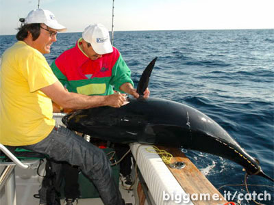 ....abbiamo preso il primo tonno di stagione, alcuni giorni prima un mio amico l'aveva preso di 93 kg e uno è stato scaricato a San Vincenzo, forse i presupposti fanno ben sperare per la stagione 2006 che é alle porte.