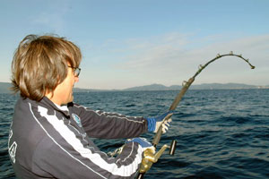 Urlo con gioia, la lenza affonda lentamente e la canna inizia a piegare, ma la cicala non parte, passano diversi secondi e la lenza si avvicina alla barca, il pesce ci passa sotto, tra la barca e la boa dell'ancora, meno male che eravamo parecchio distanti. Recuperiamo le altre canne e nello stesso tempo ci siamo mollati girando la barca; il pesce a questo punto ha sfrizionato una ventina di metri di lenza, perciò pensiamo che si tratti di uno spada, prendo allora la cintura e aggancio il giubbotto, iniziano le danze!