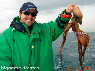 La canna dopo poco si piega, ma un peso strano si contrappone ad una canna piegata senza colpi, un grande polpo finisce nel guadino sotto gli occhi stupiti di tutti noi.
