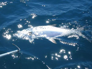 Finalmente si fa vedere due o tre volte ma poi continua ad affondare dando forti testate, comunque è stanco e poco a poco lo tiro sotto fino a che Angelo lo raffia. E' una leccia di 12,550 kg e guardandola mi accorgo che l'amo da 4/0 in lega si è spezzato all'altezza dell'ardiglione nell'osso della mascella. La battaglia è stata lunga e dura ma siamo soddisfatti dell'esito e rientriamo in porto...felici e contenti.