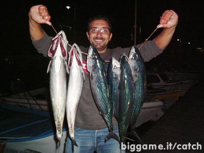 Portato in barca il primo pesce e ricalato l'esca ecco subito un altra partenza e poi ancora un'altra e così via per almeno 30 minuti. Alla fine della nostra battuta di pesca siamo tornati a terra con 6 palamite da kg 2,2 -2,3 - 2,4 - 2,5 - 2,7 - 4,2 e 5 lampughe che variavano dai 1,5 ai 2.3 kg.....