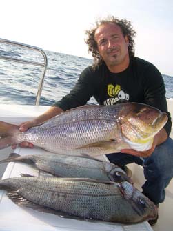 Nelle loro acrobazie nel filare a mare anche la canna armata a piombo guardiano, con la coda dell’occhio i due scoprirono con grande gioia di avere il cimino della canna sull’affondatore praticamente in acqua, grande accelerata con il motore e 5 o 6 pompate violente che portarono il malcapitato dentex a mezz’acqua ormai inerte.