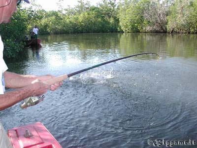 di ferrare potentemente e trattenere i pesci che si buttano sotto