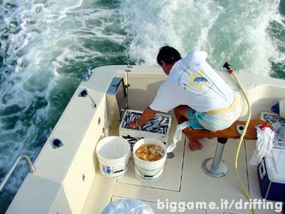 all'azione di pesca con pasturazione di sarda a barca ancorata.