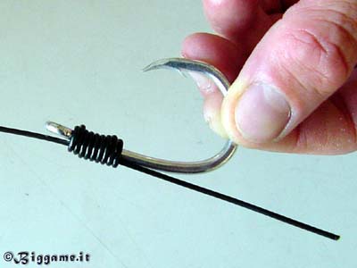 Avvolgimento delle ulteriori spire intorno al gambo dell'amo: a scendere dall'anello verso la punta dell'amo