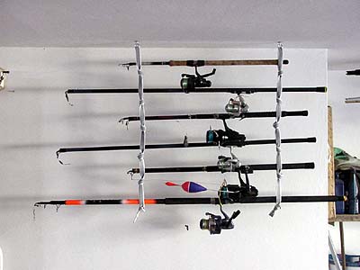 6 canne da bolentino sistemate in serie a parete;