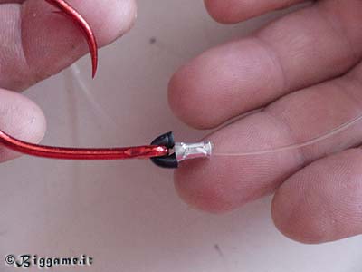 Foto ingrandita dell'impiombatura finale amo-manicotto