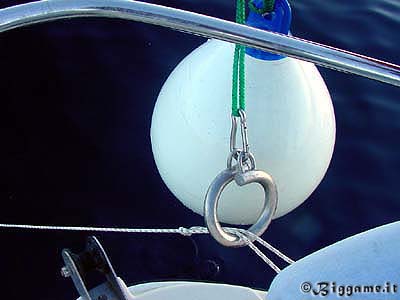 Momento finale dopo il recupero a mano della cima: si noti che la spinta della barca ha fatto si che anche la catena entrasse nell'anello.