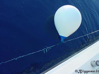 Momento di massimo sforzo, poco prima che l'ancora si stacchi dal fondo. Si nota la resistenza del pallone alla forza proveniente dalla barca e dal fondo, nonché da quella esercitata dalla resistenza della cima con l'acqua