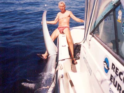 L'uomo , un istante dopo che il pesce aveva ingoiato quello sgombro