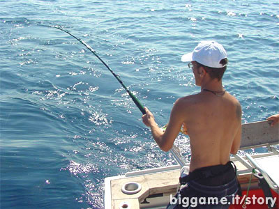 I primi istanti si sente poco il pesce, il grosso é recuperare il filo fuoriuscito per la resistenza offerta dal pesce e per l'allontanamento operato dalla barca per andare in acque più sicure. Finalmente il pesce arriva diretto sulla canna, lo sento pesante, recupero filo e lui puntualmente se lo riprende, l'aver trainato più a fondo sembra aver portato frutti più "pesanti". Più volte ritorna alla sua profondità, finché ormai esausto cede la trazione delle 30 libbre e si avvicina alla zona del raffio dove Domenico l'aspetta con impazienza...