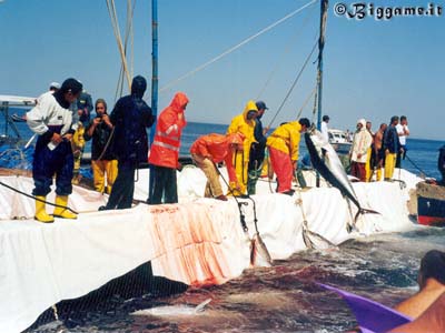 I tonni vengono issati a bordo con l'aiuto di funi e carrucole